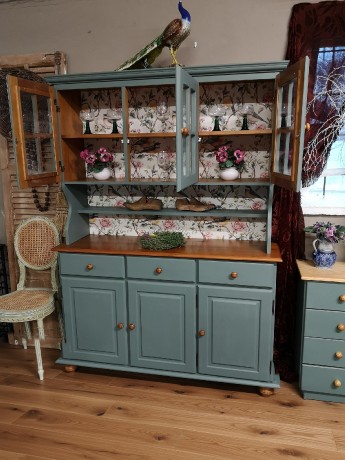 Dřevěný příborník v kombinované tmavě a světle zelené barvě. Vrchni část disponuje několika policemi k vystavení dekorací, porcelánu či knih. Spodní díl sestává ze 3 skříněk s policemi a ze 3 šuplíků. Bílé keramické úchytky. Příborník sestává ze dvou dílů.